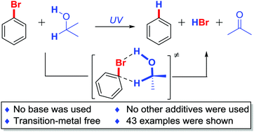 We herein report a simple and clean photo-induced metal-free reduction of C–X bond under an atmosphere of air at room temperature.