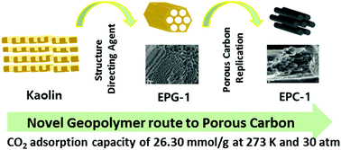 We report the synthesis of porous carbon through a novel geopolymer route, starting from natural clay kaolin.